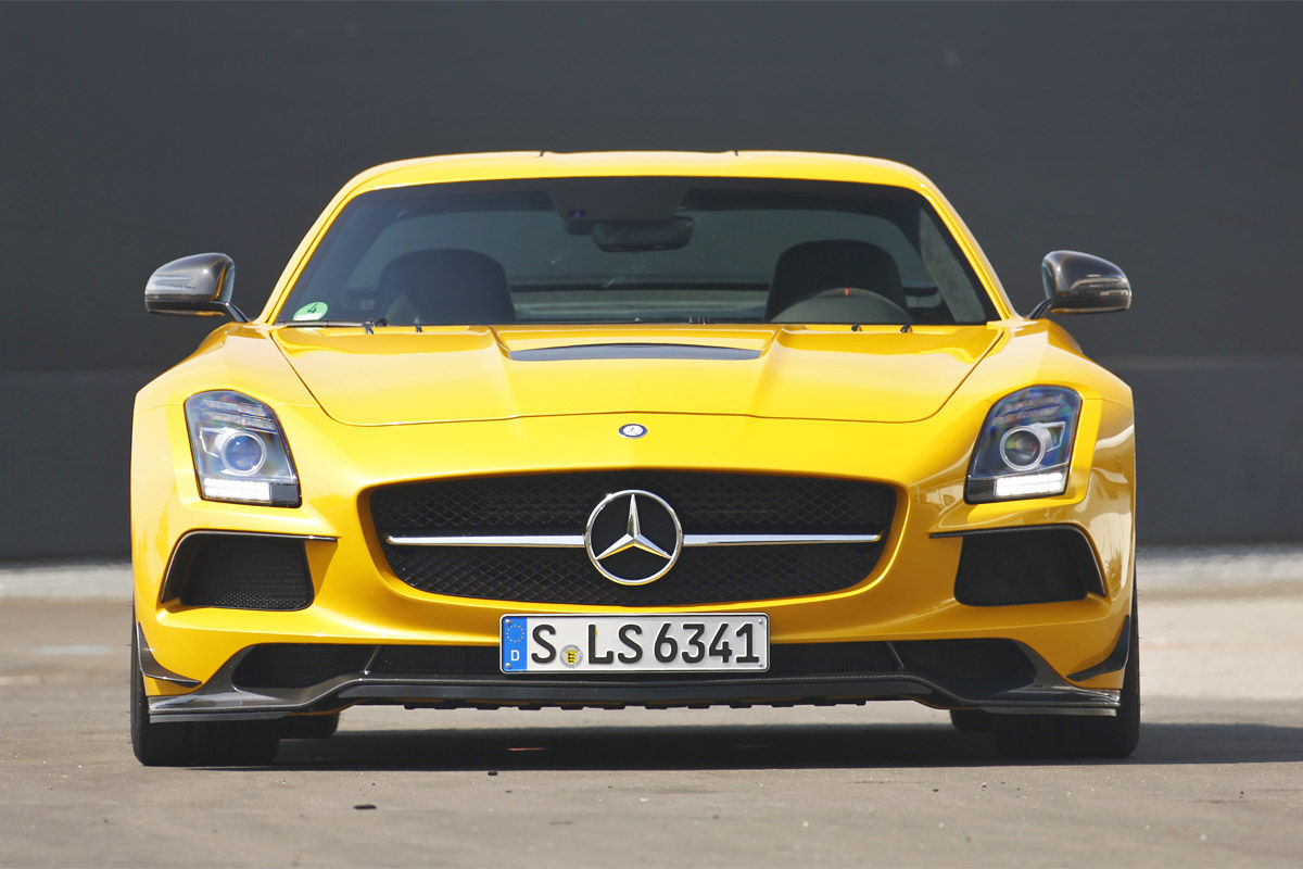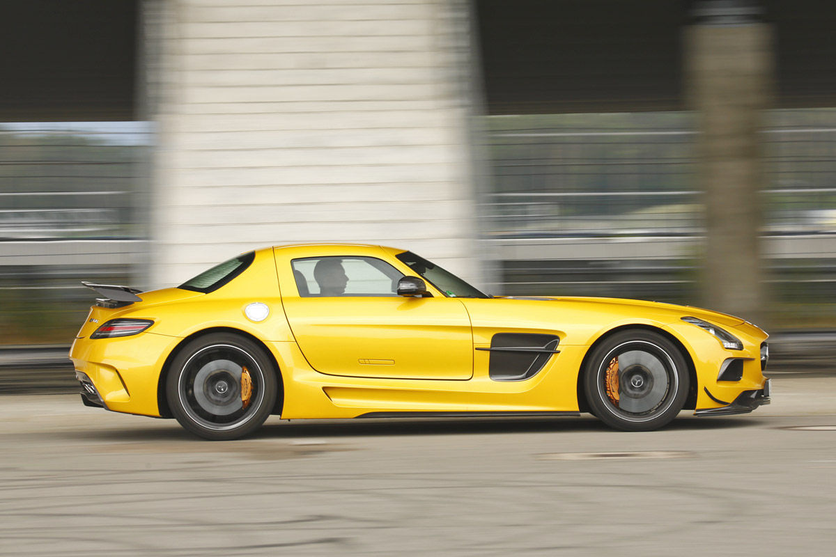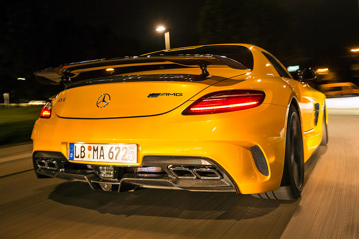 O mașină extreme pentru circuit a fost și cel mai recent erou AMG Black Series: SLS. Ca Black Series, supercarul s-a reinventat sub forma unei mașini sport perfecte. Pentru încă o dată, AMG a pus și mai multă putere în motorul V8 de 6,3 litri. Cele cinci pistoane de dimensiunea pumnului urcau până la 8.000 rpm, expediind cuplul uriaș de 635 Nm și puterea de 631 CP către roțile din spate, cu ajutorul diferențialului activ autoblocant pentru puntea din spate. Sistemul de evacuare construit din titaniu nu numai că reducea greutatea cu 13 kilograme, dar și producea o frecvență audio înaltă în stilul notelor dure din Nascar. Din punct de vedere al șasiului și al înfățișării, putea la fel de bine să se înscrie, în premieră, la o cursă de anduranță. Peste tot numai aripi, flapsuri și eleroane, plus spoilere și praguri, un măcel vizual complet. Ce gen de măcel? Unul creat de un lunetist cu armă automată. Incredibilă este însă, nu numai precizia cu care SLS taie virajele sau forța extraordinară cu care se propulsează, ci senzația de suplețe pe care o dă SLS-ul atunci când este condus la limită, aceasta fiind raportată la modul în care arată, de fapt. Crescut peste măsură, V8-ul se comportă complet dezinhibat în întreaga arie de viteze, se arunca de la 7000 rpm ca un motor de curse… Poate fi oprit doar cu ajutorul unor frâne ceramice rezistente. Puntea față ultra comunicativă, direcția exactă și nivelul de aderență, toate țintesc spre inconștiență… SLS este o creatură primitivă, barbară, care se bucură dînd din coadă la ieșirea din viraje. Dar asta este, într-un fel, esența Black Series: toate mașinile trebuie să danseze un pic înainte de a-și arăta adevărata putere și abilitate.